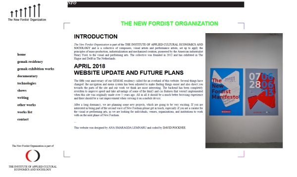 Website for the artist collective The New Fordist Organization providing information about the collective as well as presenting information and content about their 2013 residency at GEMAK gallery in The Hague.