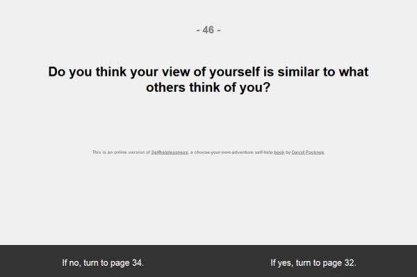 An online version of my choose-your-own-adventure self-help book. The pages were algorithmically created using Emacs lisp.