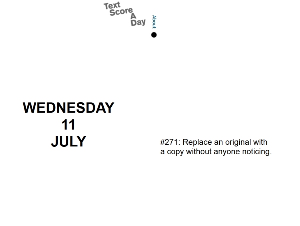 An online calendar based upon tweets from the http://www.twitter.com/textscoreaday twitter account. This account was set up by a group of five composers and visual artists who posted an experimental text score to this twitter page every day for an entire year. The project started on October 12th 2012 and ended on October 12th 2013. This calendar automatically shows a different tweet from this project every day and the arrangement of date and text randomly changes each time the page is refreshed.
